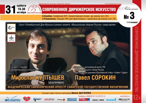 31 октября, в субботу, в 18.30, Санкт-Петербургский Дом музыки и Самарская филармония приглашают на выступление блистательного петербургского пианиста Мирослава Култышева. Победитель Международного конкурса им. Чайковского (2007) и конкурса Монте-Карло (2012) выступит с оркестром филармонии. Дирижер - Заслуженный артист России Павел Сорокин.