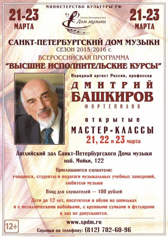 21, 22 марта с 11.00 до 16.00 и 23 марта с 11.00 до 14.00 в Санкт-Петербургском Доме музыки (Мойка, 122а) пройдут открытые для публики мастер-классы корифея российской фортепианной школы – Народного артиста России Дмитрия Башкирова.