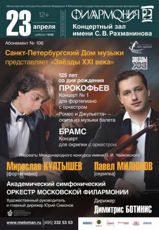 23 апреля, в субботу, в 19.00 Санкт-Петербургский Дом музыки и Московская филармония приглашают на симфонический концерт «Звёзды XXI века». На сцене концертного зала «Филармония-2» выступят победитель Международного конкурса им. П.И.Чайковского 2007 года Мирослав Култышев (фортепиано) и лауреат Международного конкурса им. П.И.Чайковского 2015 года Павел Милюков (скрипка). За дирижерским пультом – победитель Всероссийского музыкального конкурса Димитрис Ботинис.
