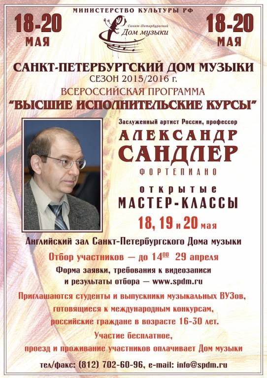18, 19 и 20 мая 2016 года в Санкт-Петербургском Доме музыки пройдут открытые мастер-классы Заслуженного артиста России, профессор Александра САНДЛЕРА (фортепиано).