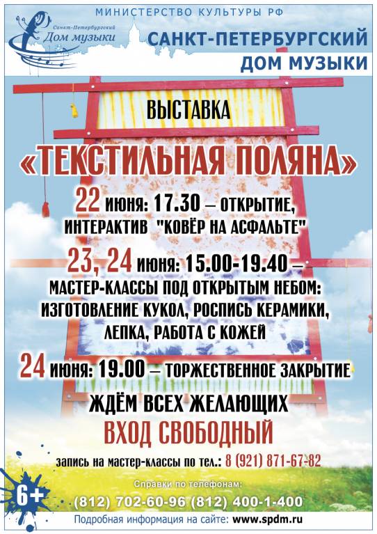 С 22 по 24 июня Санкт-Петербургский Дом музыки приглашает на Творческую акцию группы Союза художников России «Текстильная поляна» – выставки и мастер-классы под открытым небом. Посетители смогут не только ознакомиться с творчеством 18 петербургских мастеров, но и попробовать себя в роли художника.