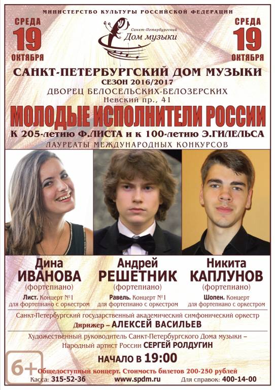 19 октября, в среду, в 19.00, в Зеркальном зале дворца Белосельских-Белозерских состоится концерт «Молодые исполнители России», посвящённый 205-летию Ференца Листа и 100-летию Эмиля Гилельса. Концертная площадка выбрана не случайно - Лист выступал во дворце Белосельских-Белозерских в 1842 году, когда впервые посетил Петербург. Спустя 174 года его музыка вновь зазвучит на этой сцене, где с оркестром выступят три молодых пианиста: Дина Иванова, Андрей Решетник и Никита Каплунов. В программе - концерты Листа, Равеля, Шопена.