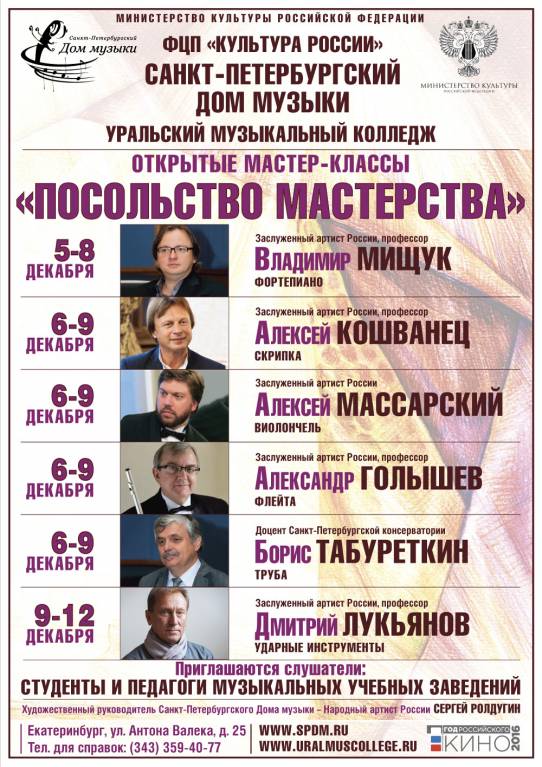 С 5 по 12 декабря Санкт-Петербургский Дом музыки впервые приглашает в Уральский музыкальный колледж на открытые для публики 4-дневные мастер-классы «Посольство мастерства». Их проведет целая плеяда выдающихся артистов и музыкальных педагогов России – Владимир Мищук (фортепиано), Алексей Кошванец (скрипка), Алексей Массарский (виолончель), Александр Голышев (флейта), Борис Табуреткин (труба), Дмитрий Лукьянов (ударные инструменты).