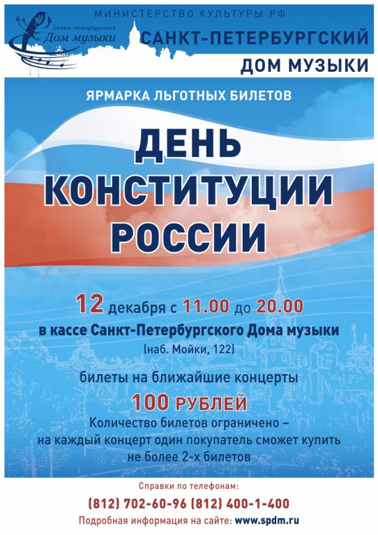 12 декабря, в понедельник, с 11:00 до 20:00, в честь Дня Конституции России, в кассе Дома музыки на Мойке, 122 пройдёт ярмарка льготных билетов. Все желающие смогут приобрести льготные билеты на ближайшие концерты по 100 рублей. Количество билетов ограничено, на каждый концерт один покупатель сможет купить не более 2-х билетов на следующие концерты.