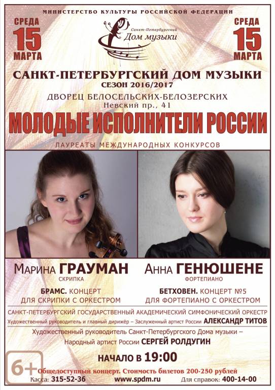 15 марта, в среду, в 19.00, Санкт-Петербургский Дом музыки приглашает во дворец Белосельских-Белозерских (Невский проспект, 41) на симфонический концерт «Молодые исполнители России». На сцене Зеркального зала княжеского дворца - молодые солистки, лауреаты международных конкурсов: Марина Грауман (скрипка) и Анна Генюшене (фортепиано). За дирижёрским пультом - Заслуженный артист России Александр Титов.