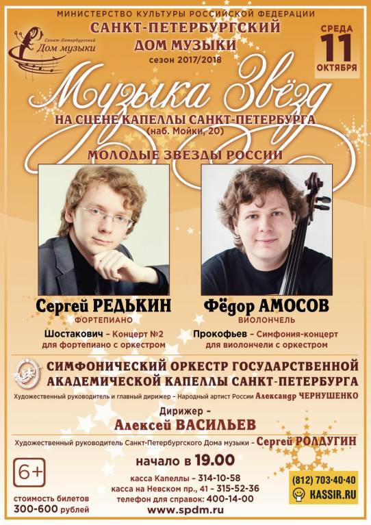 11 октября, в среду, в 19.00, Санкт-Петербургский Дом музыки приглашает в Капеллу Петербурга (наб. Мойки, 20) на первый концерт абонемента «Музыка звёзд». С оркестром Капеллы под управлением Алексея Васильева выступят блистательные молодые солисты России — Сергей Редькин (фортепиано) и Фёдор Амосов (виолончель).