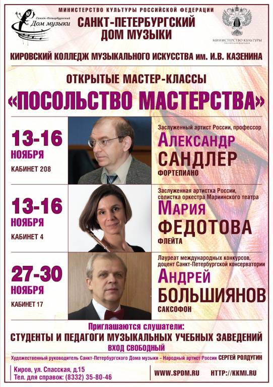 Санкт-Петербургский Дом музыки вновь приглашает на мастер-классы проекта «Посольство мастерства». В этот раз – с 13 по 16 и с 27 по 30 ноября открытые мастер-классы примет Кировский колледж музыкального искусства им. И.В. Казенина. Занятия проведут Заслуженный артист России, профессор Александр Сандлер (фортепиано), Заслуженная артистка России, солистка оркестра Мариинского театра Мария Федотова (флейта) и доцент Петербургской консерватории Андрей Большиянов (саксофон).