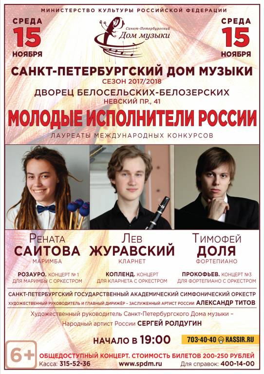 15 ноября, в среду, в 19.00, Санкт-Петербургский Дом музыки приглашает на симфонический вечер для маримбы, кларнета и фортепиано «Молодые исполнители России». В Зеркальном зале дворца Белосельских-Белозерских (Невский пр., 41) выступят финалисты всероссийского проекта «Река талантов»-2017: Рената Саитова (маримба), Лев Журавский (кларнет) и Тимофей Доля (фортепиано).