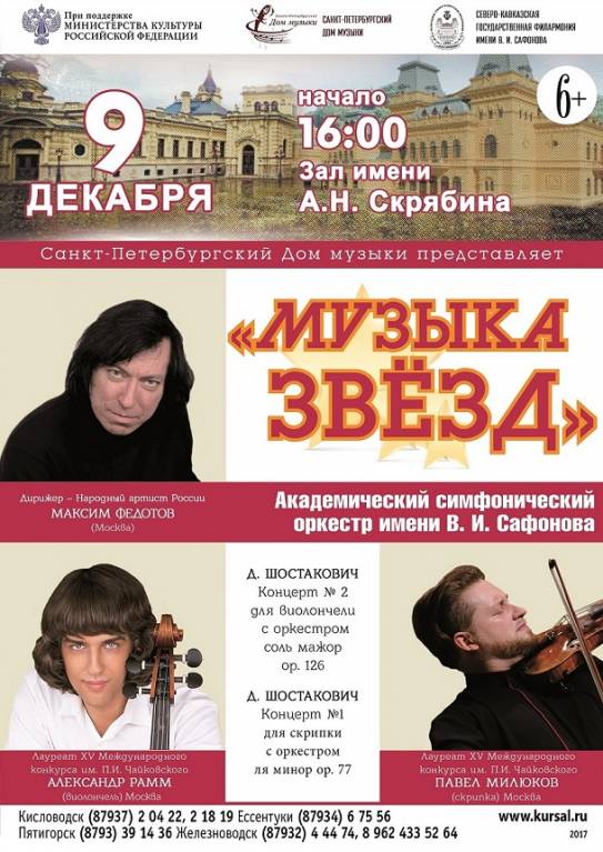 «Музыка звезд» – цикл выступлений молодых звёзд России – солистов Санкт-Петербургского Дома музыки и Московской государственной филармонии на сцене Капеллы Санкт-Петербурга и в Зале им. Скрябина Северо-Кавказской филармонии (Кисловодск). Ежегодно на каждой площадке проходит отдельный абонемент из 5 концертов, в программах которых с оркестром выступают 10 выдающихся молодых солистов России. Следующий концерт солистов Дома музыки состоится уже в новом году – 20 января 2018. Для слушателей выступят Оксана Сидягина (арфа), Роман Маркелов (саксофон) и Виталий Стариков (фортепиано).