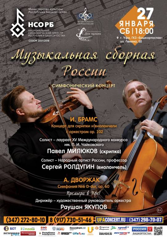 27 января, в субботу, в Уфе на сцене ГКЗ «Башкортостан» в рамках цикла «Музыкальная сборная России» выступят Народный артист России Сергей Ролдугин (виолончель) и лауреат XV Международного конкурса им. Чайковского Павел Милюков (скрипка). Дирижировать Национальным симфоническим оркестром Республики Башкортостан будет Раушан Якупов.