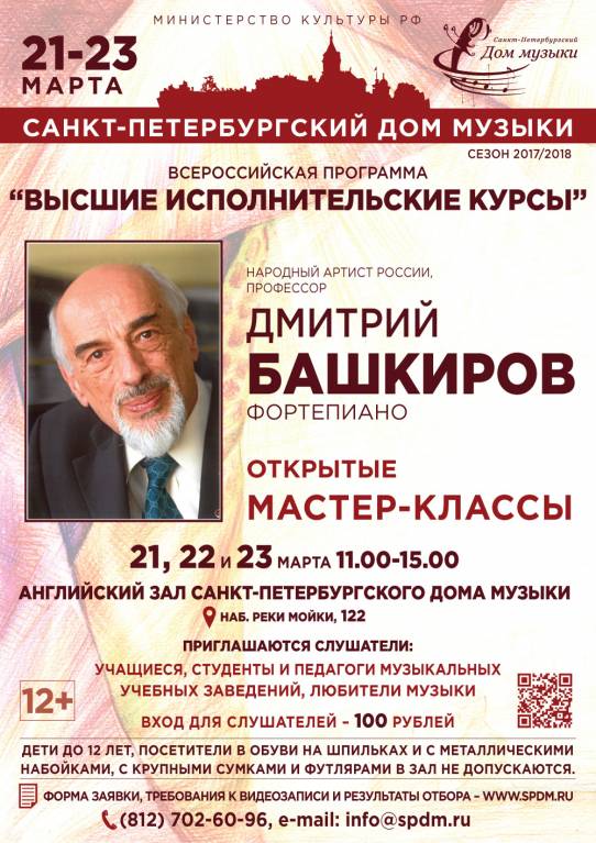 21, 22 и 23 марта (СР, ЧТ, ПТ), с 11.00 до 15.00, в Доме музыки (наб. Мойки, 122) пройдут интенсивные открытые мастер-классы для молодых пианистов. Долгожданным гостем в Английском зале станет прославленный музыкант — Дмитрий Башкиров.