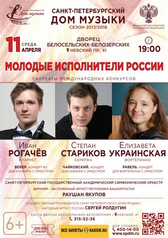 11 апреля, в среду, в 19.00, Санкт-Петербургский Дом музыки приглашает петербуржцев и гостей города посетить красочную программу «Молодые исполнители России». Во дворце Белосельских-Белозерских на Невском, 41 выступят молодые лауреаты международных конкурсов – Степан Стариков (скрипка), Иван Рогачёв (кларнет) и Елизавета Украинская (фортепиано).