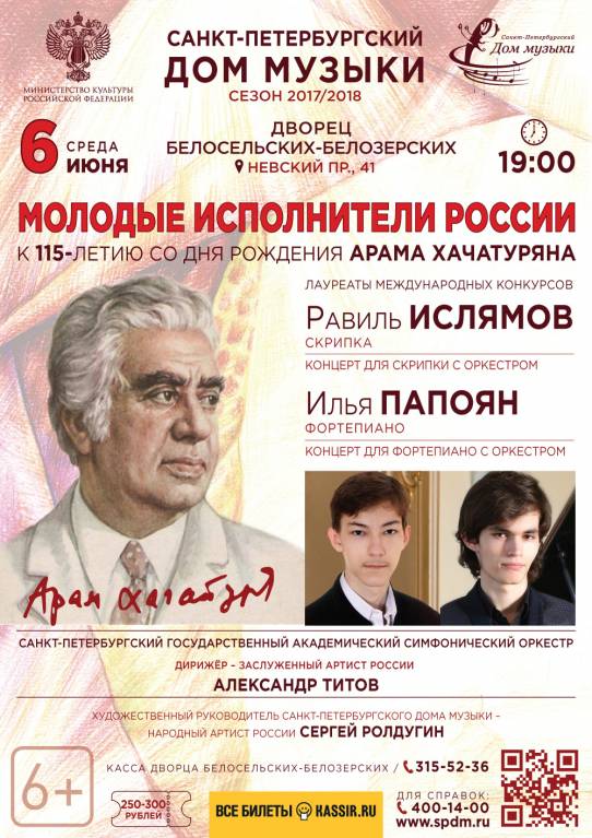 6 июня, в среду, в 19.00, Санкт-Петербургский Дом музыки приглашает во дворец Белосельских-Белозерских (Невский пр., 41) отметить юбилей Арама Хачатуряна. К 115-летию композитора в программе «Молодые исполнители России» с оркестром выступят: скрипач Равиль Ислямов и пианист Илья Папоян.