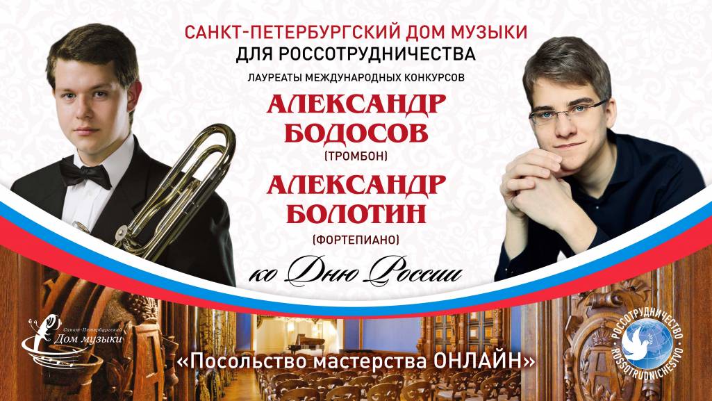12 июня, в пятницу, в 13.00, состоится трансляция праздничного концерта "Посольство мастерства ОНЛАЙН" в честь Дня России. Шедевры русской классической музыки исполнят солисты Санкт-Петербургского Дома музыки, лауреаты международных конкурсов Александр Болотин (фортепиано) и Александр Бодосов (тромбон). В программе: Чайковский, Римский-Корсаков, Рахманинов, Прокофьев и др.