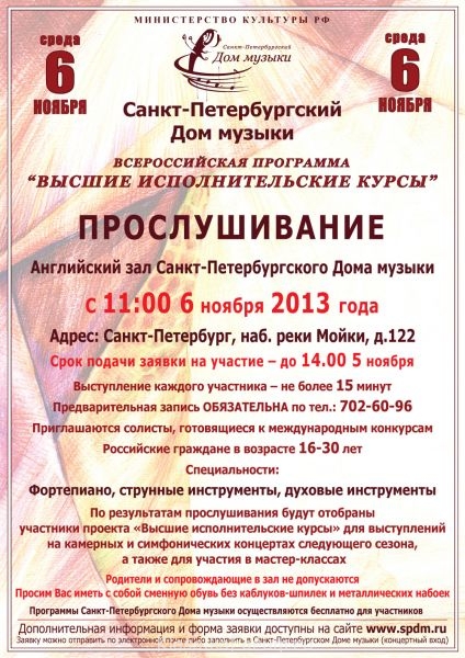 6 ноября, в среду, в Санкт-Петербургском Доме музыки состоится очное прослушивание на участие в программе «Высшие исполнительские курсы». По результатам прослушивания будут отобраны участники для выступлений на камерных и симфонических концертах следующего сезона, а также для участия в мастер-классах. Приглашаются студенты средних специальных учебных заведений, студенты, выпускники и аспиранты музыкальных вузов России, готовящиеся к участию в международных конкурсах и фестивалях. Возраст участников – от 16 до 30 лет, гражданство – российское. Приём заявок – до 14.00 5 ноября. Заявку можно отправить по электронной почте либо заполнить в Санкт-Петербургском Доме музыки (концертный вход) в будние дни.