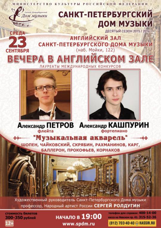 23 сентября, в среду, в 19.00 на сцене Санкт-Петербургского Дома музыки (наб. Мойки, 122) в цикле "Вечера в Английском зале" выступят молодые российские солисты: победитель Международного фестиваля-конкурса «Окно в Европу» (Санкт-Петербург, 2010) флейтист Александр Петров и победитель, обладатель специальных призов Международного конкурса молодых пианистов им. Шопена (Словения, 2013) пианист Александр Кашпурин.