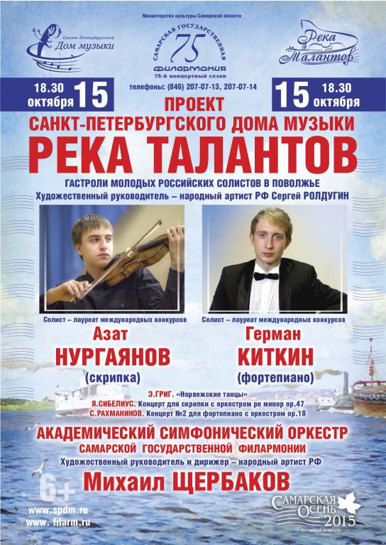 15 октября, в четверг, в 18.30, Санкт-Петербургский Дом музыки приглашает в Самарскую филармонию на открытие гастролей IX сезона проекта «Река талантов». Совместно с симфоническим оркестром филармонии выступят скрипач Азат Нургаянов из Казани и пианист Герман Киткин из Москвы. 14 октября солисты выступят в Детской музыкальной школе им. Ю.Башмета с программой из произведений с XVII по XX век.