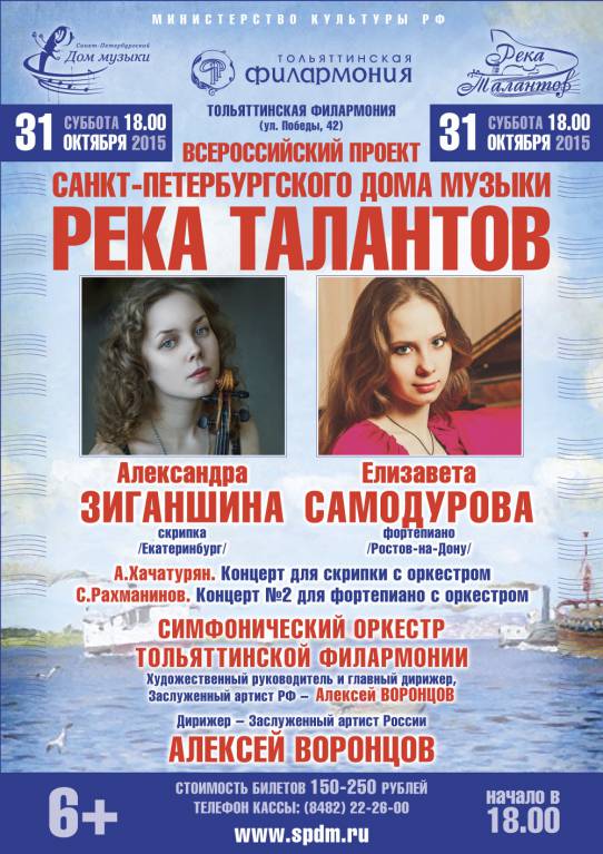 31 октября, в субботу, в 18.00 Санкт-Петербургский Дом музыки приглашает в Тольяттинскую филармонию, где состоится очередной концерт проекта «Река талантов». Лауреаты международных конкурсов скрипачка Александра Зиганшина и пианистка Елизавета Самодурова выступят с оркестром филармонии. За дирижерским пультом - Заслуженный артист РФ Алексей Воронцов.